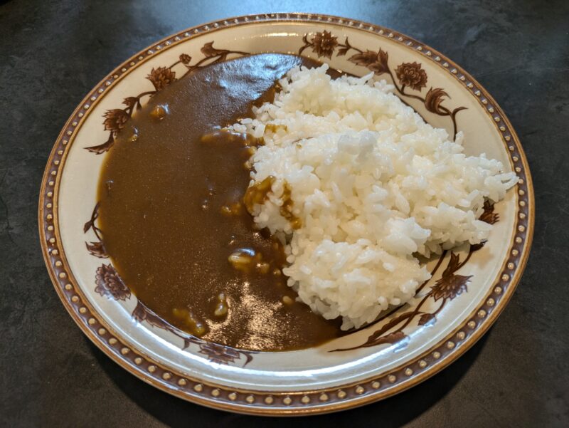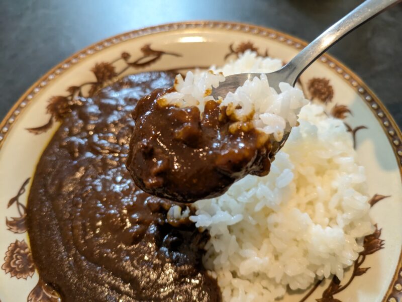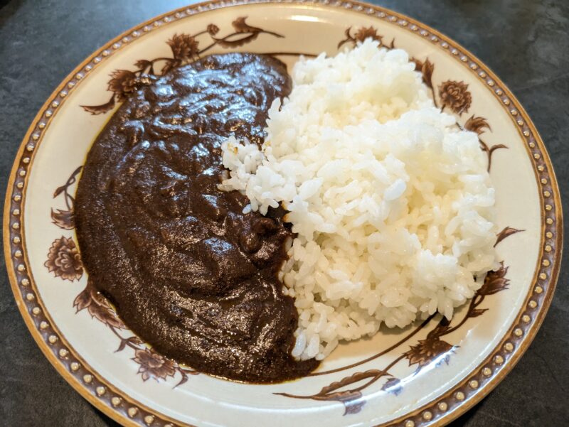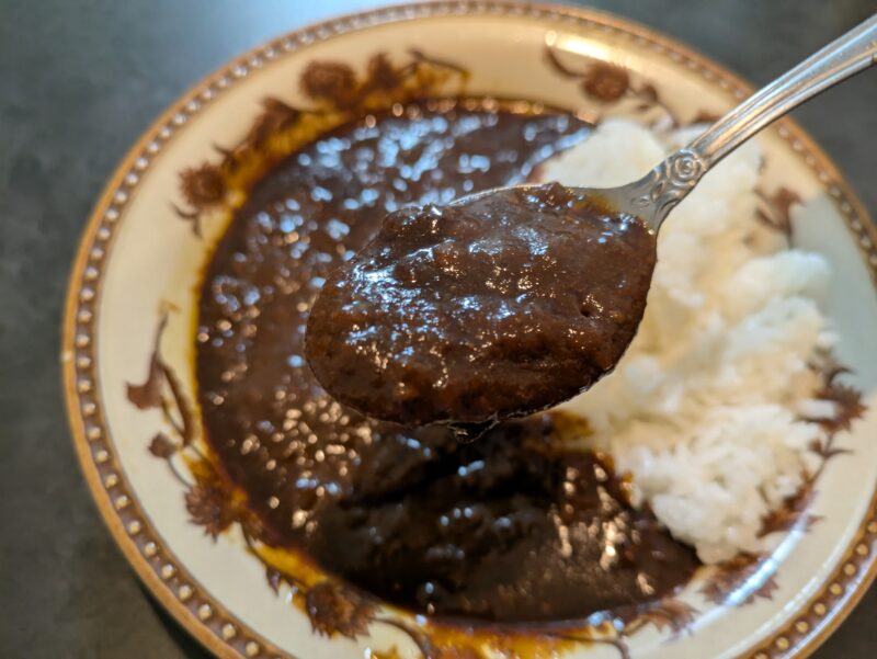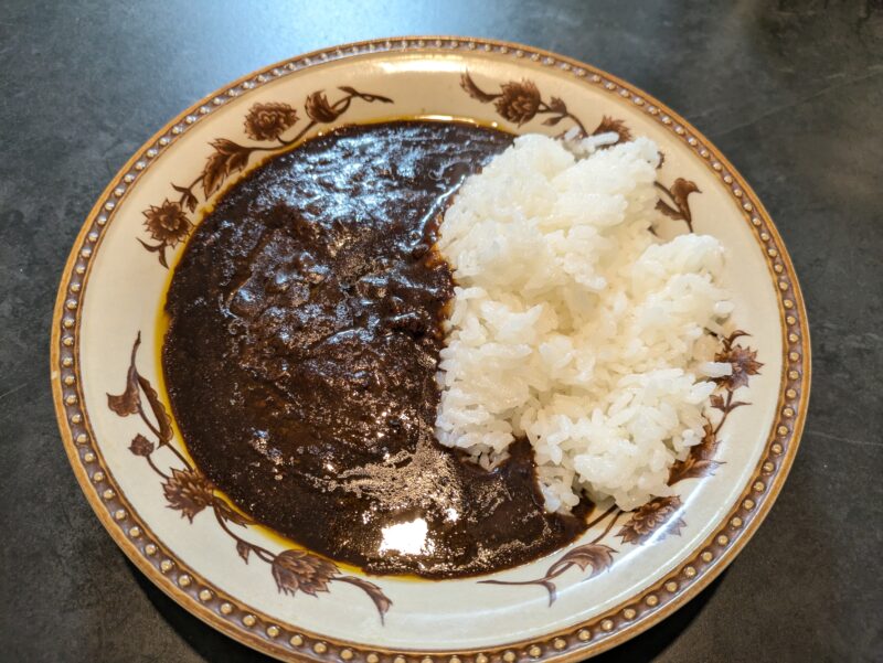 光の反射が映える程の黒光りのカレールーで高級感を感じます。パッケージみたいにトッピングで彩りを添えるともっと映えるかもしれませんが家にはカレー以外なかったのでそのままで食します。