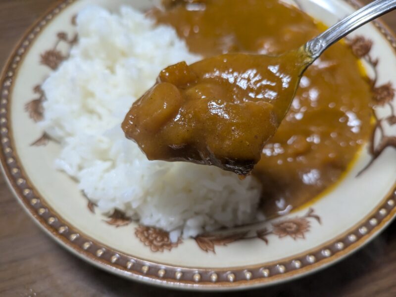 辛味は辛過ぎず甘過ぎずの見事な中辛といったところ。後味もずっと舌に残らないようなスッキリ感で小さい子でも食べやすいかと思いますね。