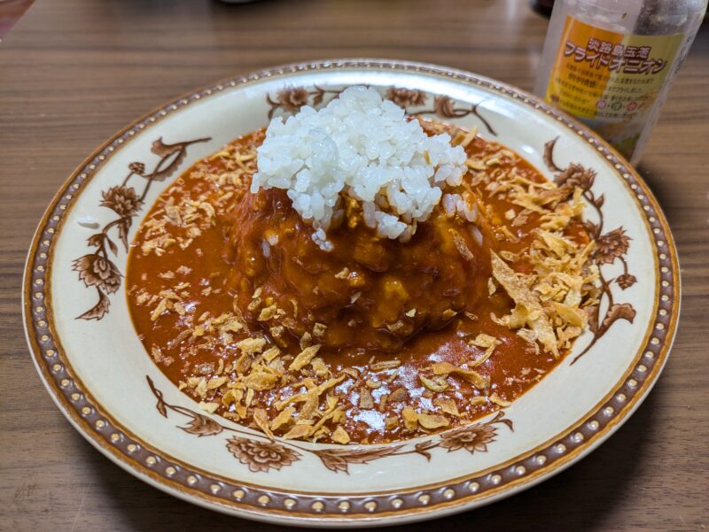 ピリ辛が強いせいかカレーだけでは単調な味ですがフライドオニオンが程よく混ざって美味しい。