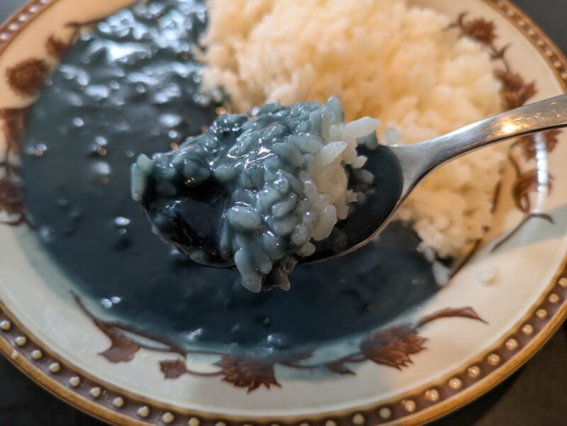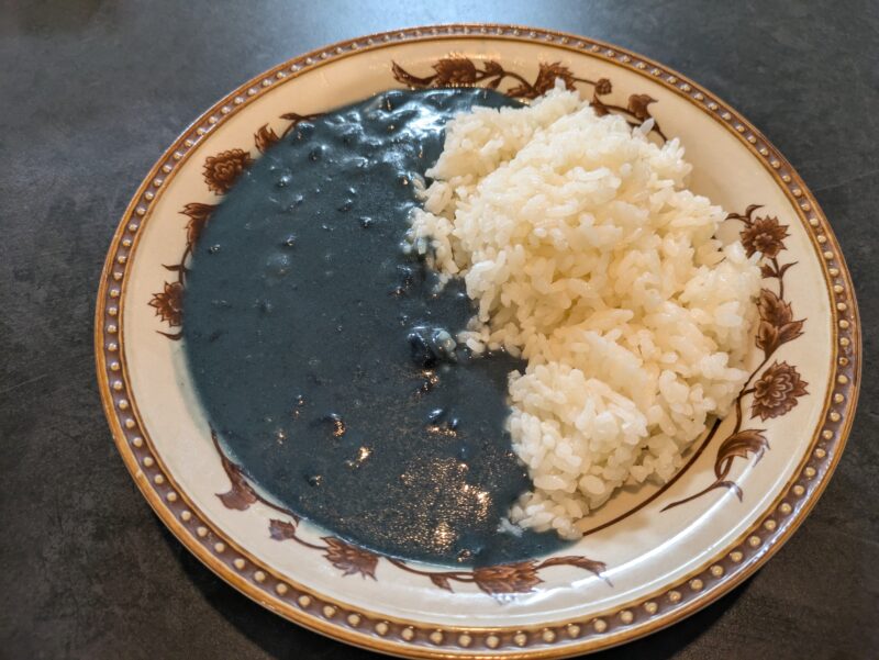 なんですかねこれ…インディゴ色のカレールー???食べて大丈夫なやつなのですかねこれは?